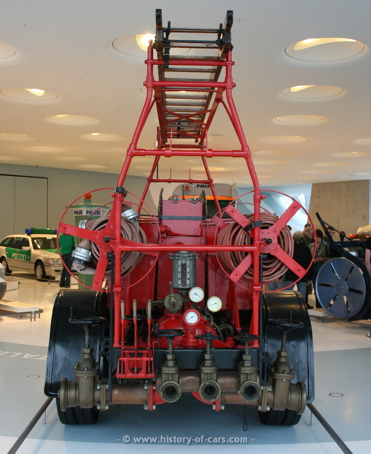 Dies ist ein Feuerwehrfahrzeug, wie er vor dem ersten Weltkrieg üblich war. Er hatte noch Vollgummireifen und Kettenantrieb.